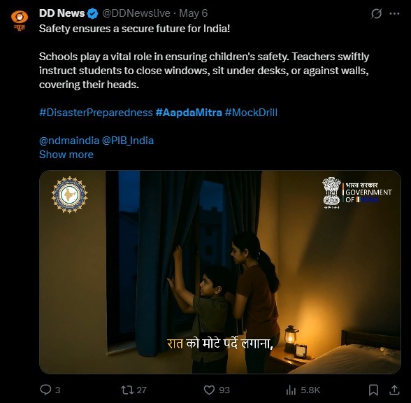The National Disaster Management Authority (NDMA) had to roll out a nationwide civil defence campaign under emergency conditions. Citizens needed to know how to act during blackout drills, schools had to be guided with clear safety protocols, and the role of Aapda Mitra, trained community volunteers, had to be highlighted to reassure the public. This wasn’t just about communication; it was about mobilising awareness at scale, across every state and every demographic, in a matter of days. It was about training the people in a state of chaos, turning uncertainty into preparedness before panic could take over.
